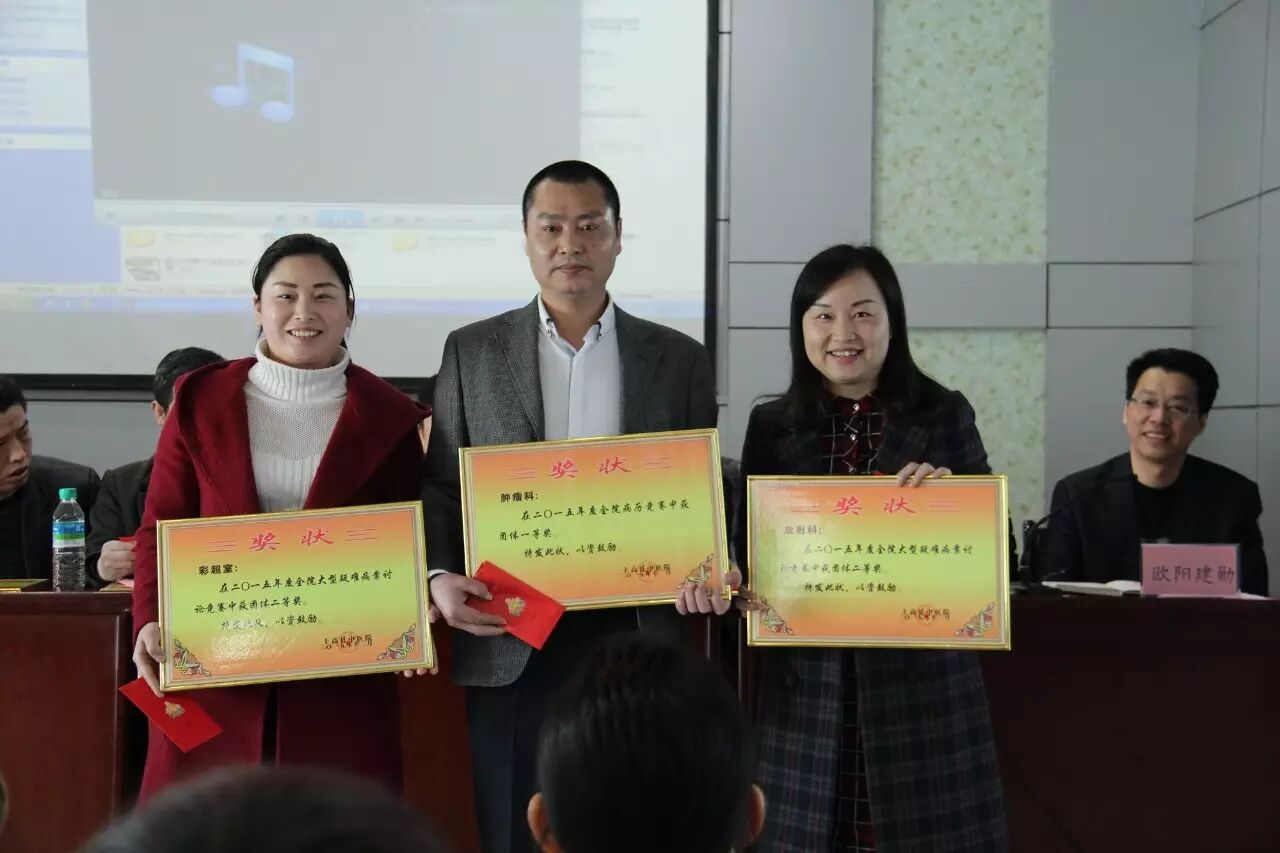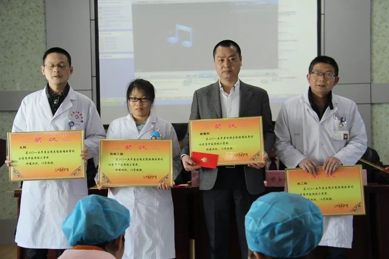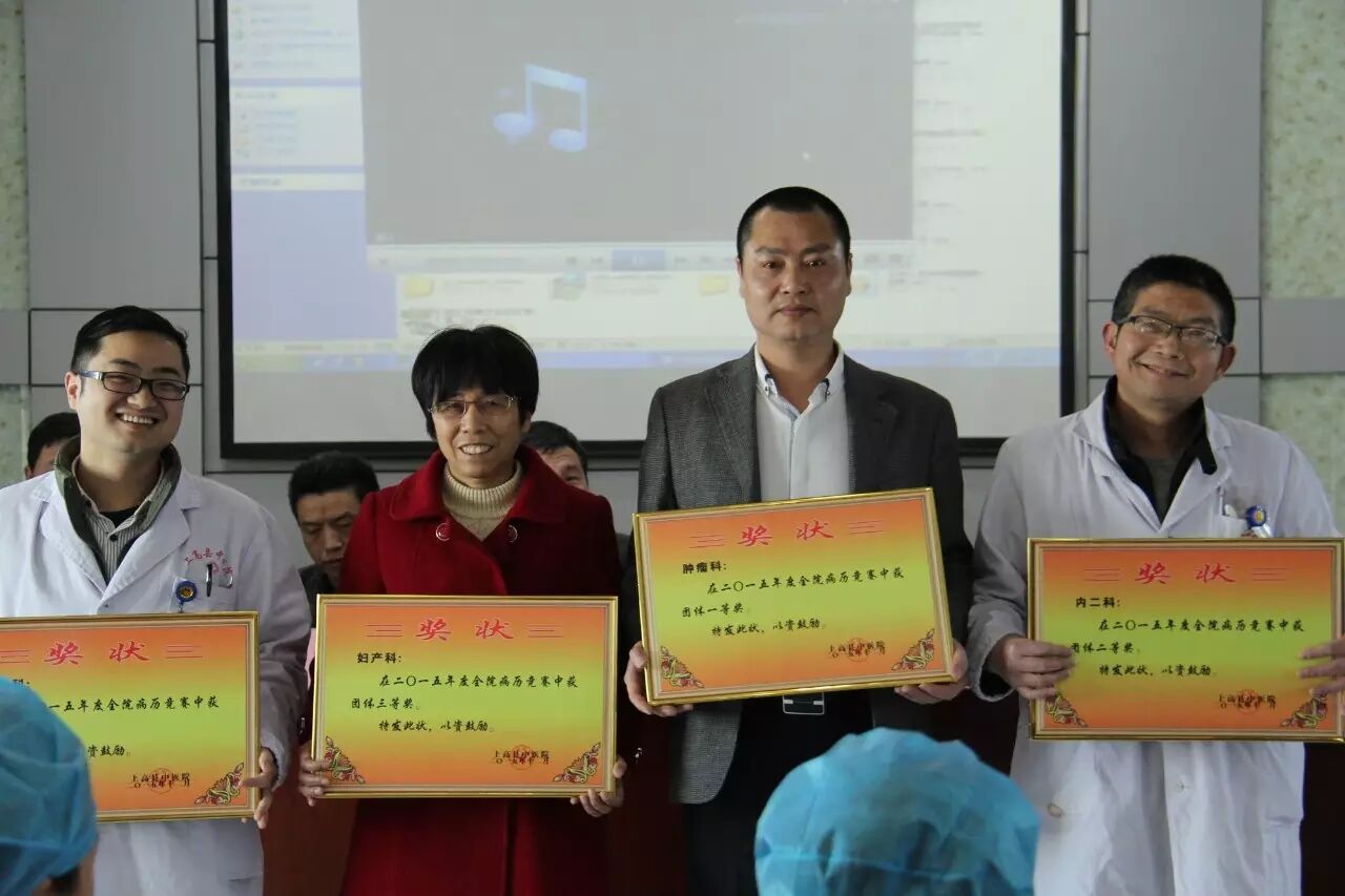 会议由党支部副书记欧阳建勋主持。副院长李苏玲宣读了荣获院级以上荣誉的集体、个人等表彰名单,并为2015年度十佳医德标兵、先进集体、全院大型疑难病案讨论竞赛团体奖、病历竞赛团体奖、护理技能竞赛团体奖等获奖科室和个人颁奖。![]()