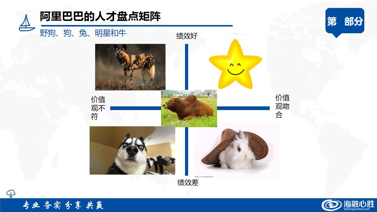 阿里巴巴将所有的员工分成了三种类型:有业绩没团队合作精神的,是“野狗”;和事佬、老好人,没有业绩的,是“小白兔”;有业绩也有团队精神的,则是“猎犬”。阿里巴巴需要的是“猎犬”,而不是“小白兔”和“野狗”。对于小白兔,公司会通过业务培训来提升他们的专业素质,而对于“野狗”,公司在教化无力的情况下,一般都会坚决清除。
