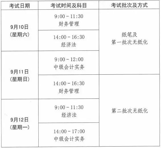 中级资格考试定于9月10-12日举行。其中,中级资格实行纸笔方式考试时间为9月10日-11日,实行无纸化考试共两个批次,在9月10日-12日内进行考试。中级资格考试为三个科目,其中:《财务管理》和《经济法》科目考试时长均为2.5小时,《中级会计实务》科目考试时长为3小时。中级资格无纸化考试科目与纸笔考试科目的时长相同,分两个批次进行。高级资格考试时间为9月11日,考试科目为《高级会计实务》,考试时长为3.5小时。