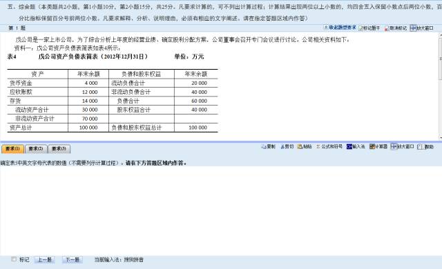 “试题区域”是主体部分,选择判断题界面很简单,主要带大家看看计算分析题、简答题、综合题的界面: