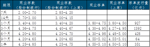 同业存款:本周同业存单发行量继续下行,降至不足3200亿元,发行主要集中在1个月及3个月品种,其中股份制银行1个月存单价格维持在4.00,周中有所上行后回落至4.00,3个月存单价格上行至4.60-4.63,6个月存单价格上行至4.62-4.65。同业存款方面,3个月以上存款价格较上周有所上行。