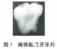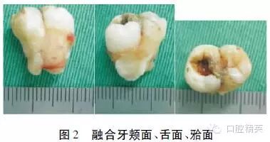 离体患牙牙片显示:两牙牙釉质和牙本质相互融合,共1个髓腔,2个根管(图3)。