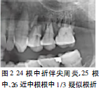 X线片示:24根中折,两断端间移位约1.5mm,根尖区可见低密度影;25根中1/3、26近中根根中1/3处疑似根折,但根尖周膜腔清晰,硬板完整,上颌牙槽骨骨小梁明显减少,密度减低(图2)。