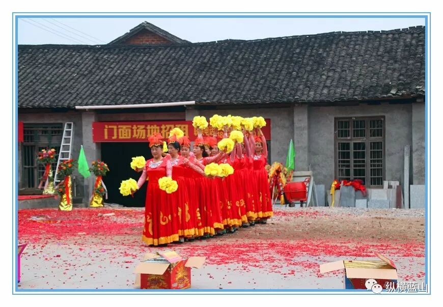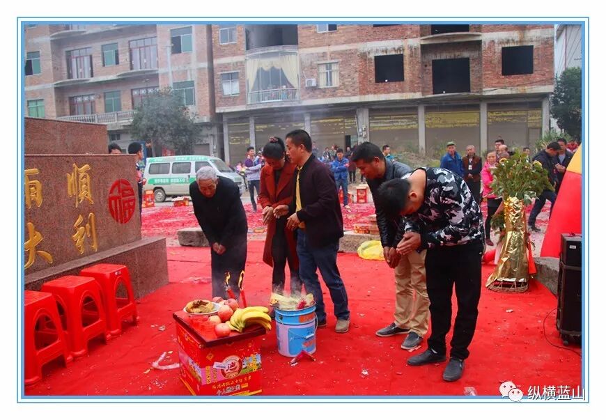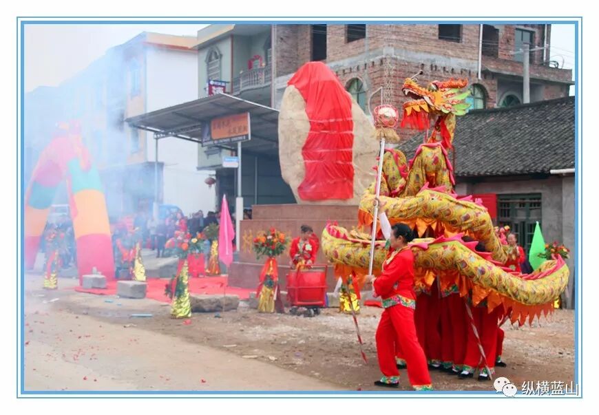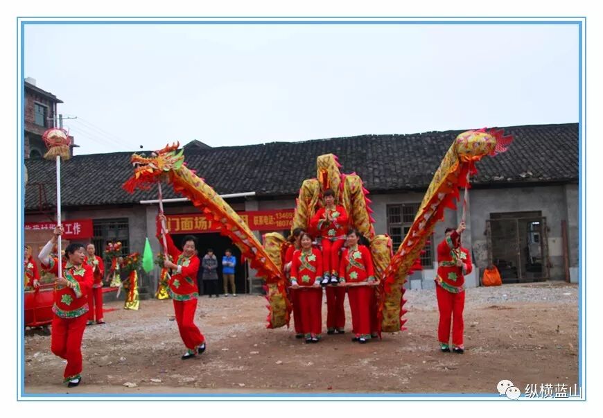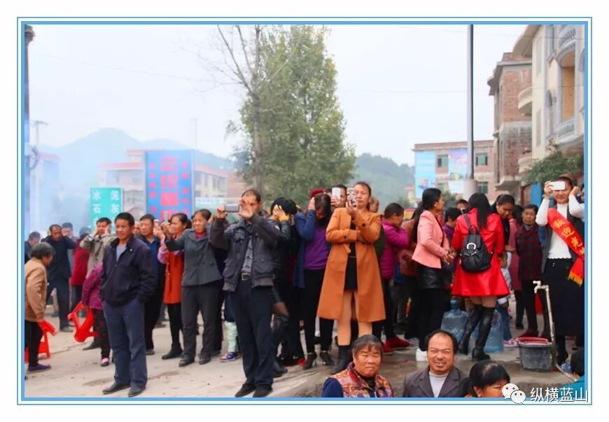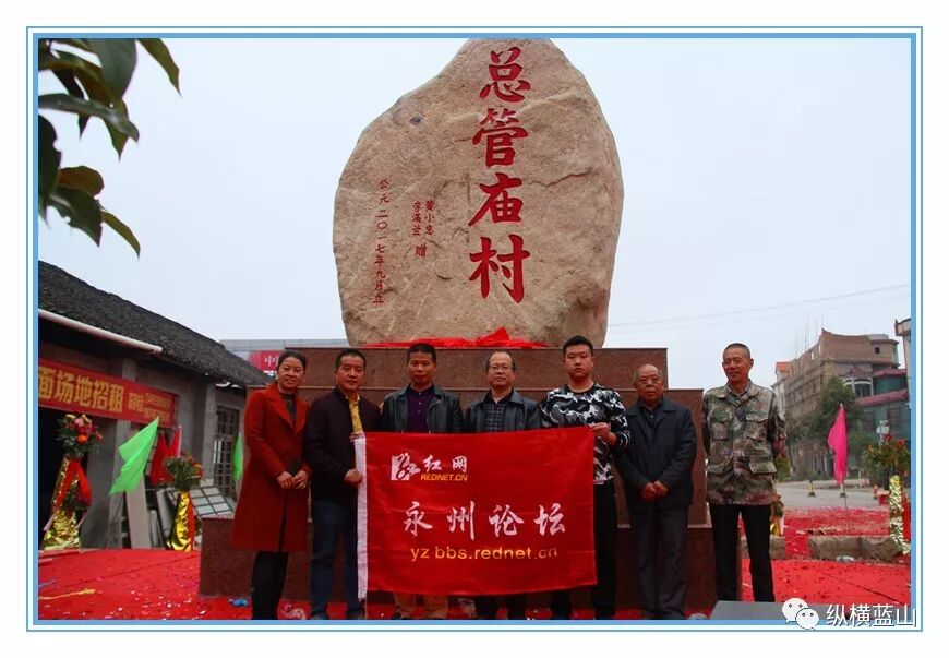 2017年11月13日,蓝山县总管庙村红旗招展,彩旗飘扬,鞭炮齐鸣,彩龙飞舞,夕阳红腰鼓队表演欢乐喜庆的舞蹈。村民脸上挂上喜悦的笑容,500多人参加了由村支两委组织的村道全线贯通典礼和村标落成揭牌仪式。