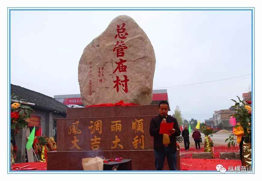 总管庙村隶属于舜源街道办总市社区,在舜源街道办指导下,2017年组建了总市社区,选举了新的领导班子。2017年,总市社区党员干部积极响应上级号召,凝聚群众,集思广益,开展新农村建设。一条村道于2017年10月5日动工,2017年11月13日全线贯通。由该村两新党员、社区妇联黄小忠和李满兰捐赠的村标于今天上午9:30时顺利揭牌,标志着蓝山县总管庙村新农村建设进入新的时期。