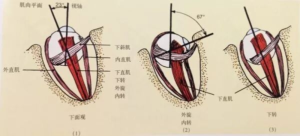 ▲ 单独内直肌的作用(右眼)左正面观-右上面观-箭头方向示内直肌收缩产生的眼球内转作用