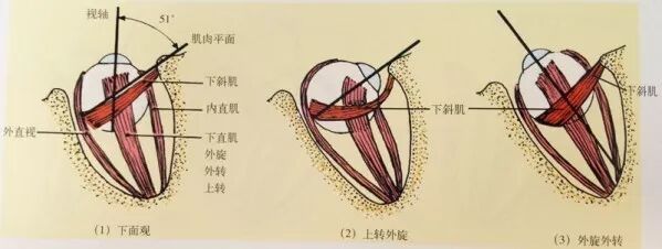 ▲ 单独外直肌的作用(右眼)左正面观-右上面观-箭头方向示内直肌收缩产生的眼球外转作用