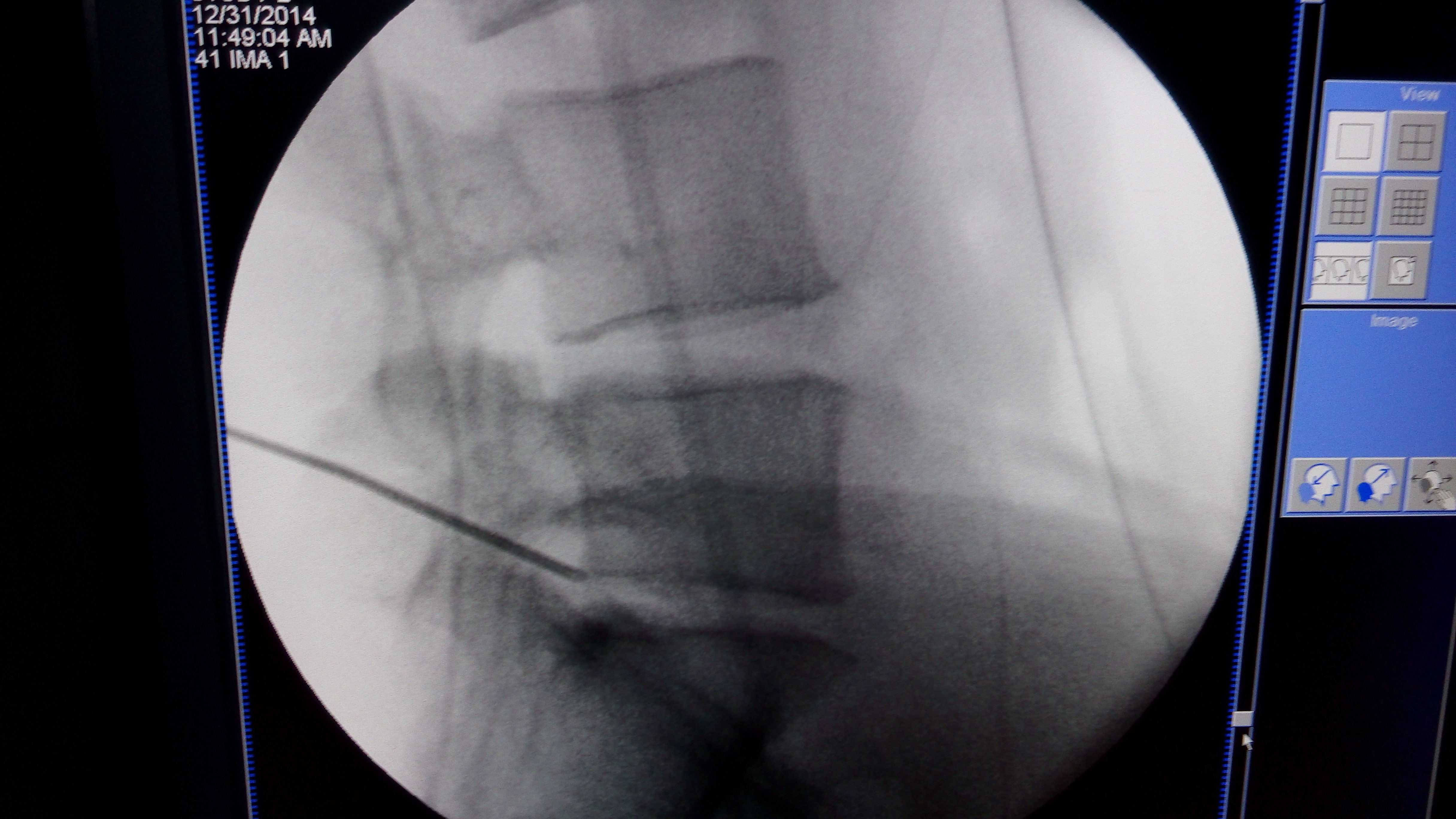 在透视下注入少量造影剂可协助确认针尖在蛛网膜下腔,如怀疑注射的造影剂一部分在硬膜下腔,另有一部分在蛛网膜下腔,那么应改变进针深度,有时需要拍摄侧位X线片以确保进针达合适的深度。如脑脊液流出正常,即可缓慢注入造影剂。
