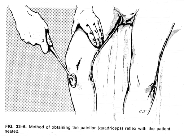 受L2、3和L4支配的股四头肌和髋关节内收肌群的肌力可能减弱,椎间盘严重破裂突出时,可出现肌肉萎缩。反射检查时可发现膝反射迟钝或消失(L 2、L3、L4)以及胫前肌腱反射迟钝或消失(L4);L4神经根支配的皮肤区域可出现感觉减退,其单独支配区位于小腿内侧,自主感觉区位于内踝水平。