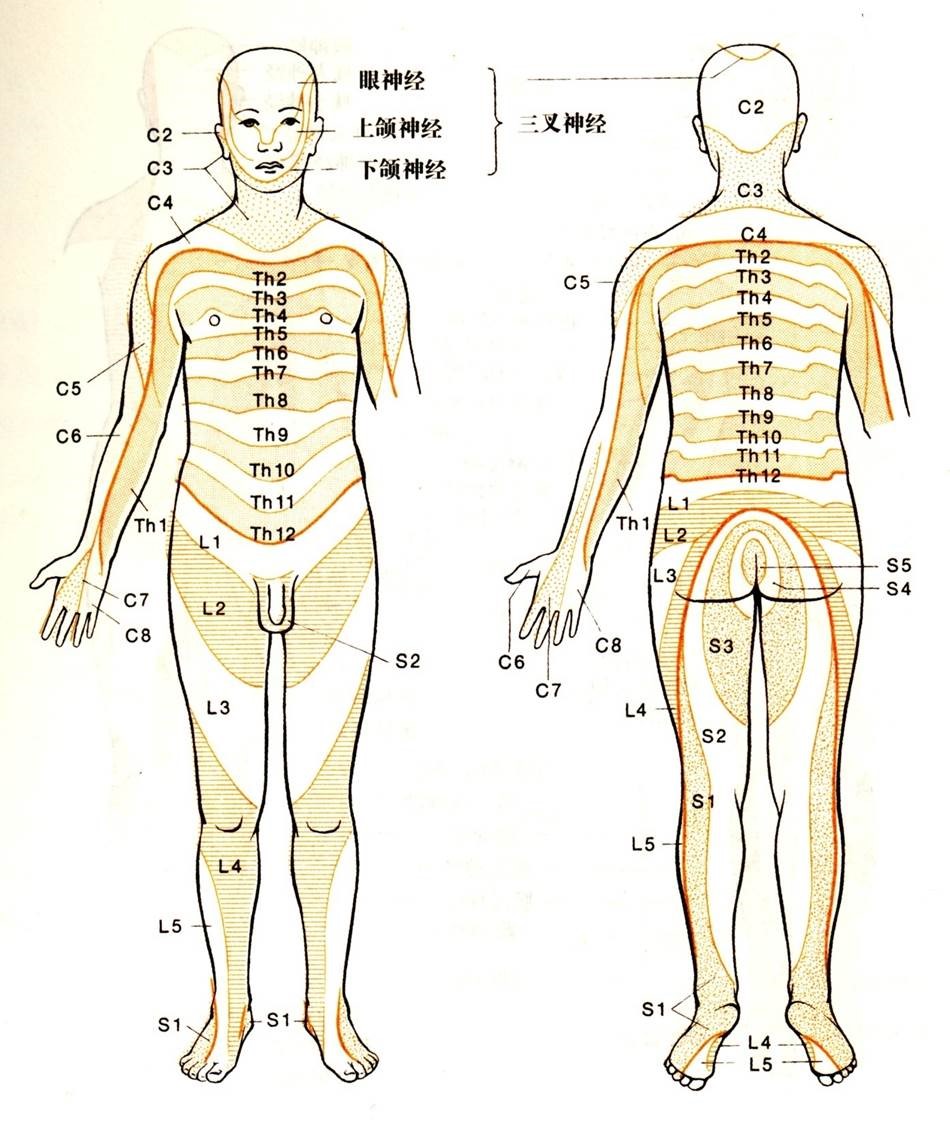 腰5神经根压迫:此神经根的根性疼痛沿其支配的皮肤节段分布,如果存在麻木,也沿其皮肤支配区分布,位于小腿前外侧和足背及足趾背侧。L5神经根的自主区位于第一趾蹼和第三趾背。感觉损害:小腿前外、趾和足背面,肌力减退:臀中肌、趾长伸肌和趾短伸肌,反射异常:通常无异常、偶尔胫后肌反射异常(难引出)。