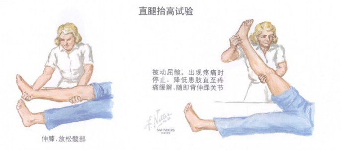 如果有神经根刺激征,一般以坐骨神经的走行为中心,可见于近侧的坐骨切迹和远侧的腘窝。除此之外,在膝部牵拉坐骨神经可产生臀部和大腿、小腿疼痛(即疼痛超过膝关节)。