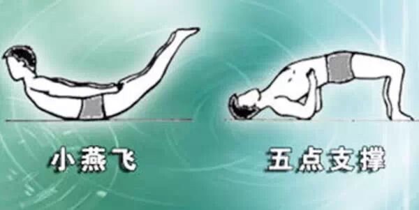 五点支撑法:仰卧在床上,去枕屈膝,双肘部及背部顶住床,腹部及臀部向上抬起,依靠头肩(一个点)、双肘部(二个点)和双脚(二个点)这五点支撑起整个身体的重量,持续3~5秒,然后腰部肌肉放松,放下臀部休息3~5秒为一次练习。练习周期同小燕飞法。