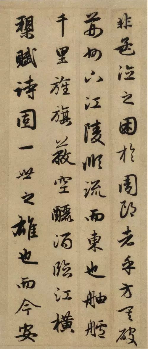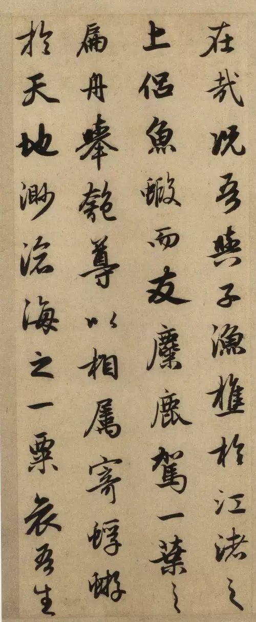 此卷中的三点水较多,但写法上并不强求多变,而大多只是行笔间的细微差异。附图中“酒”、“渺”二字采用上断下连的写法,这也是最常见的处理,只有“流”、“江”、“海”等少烽字作了变化。
