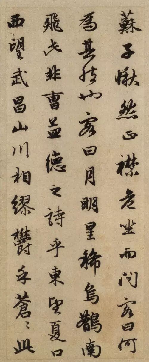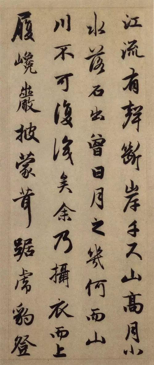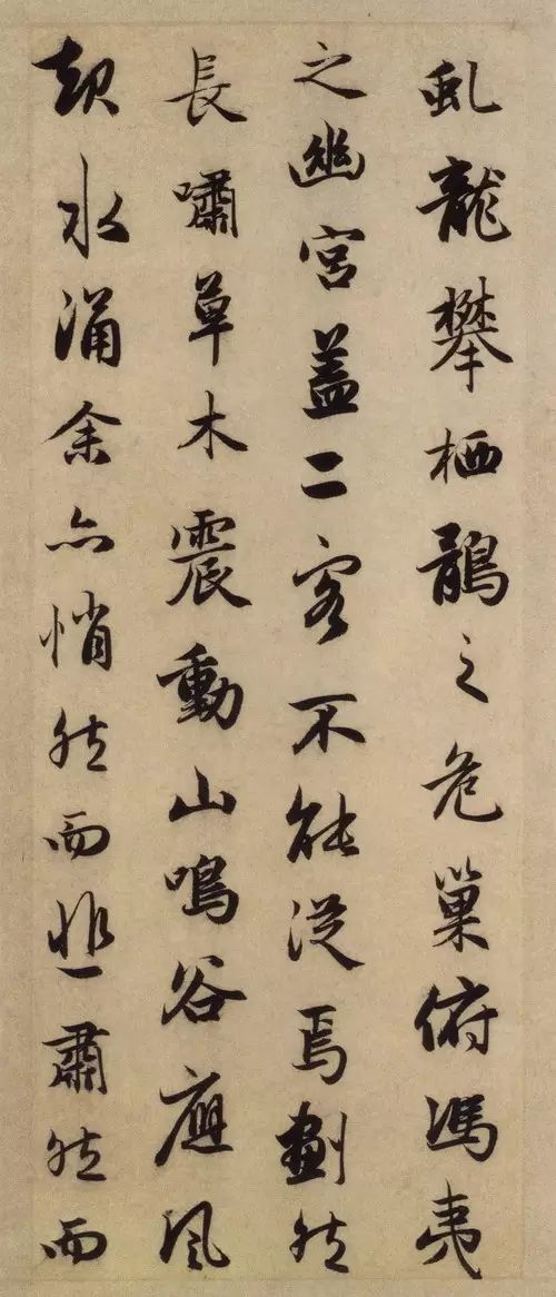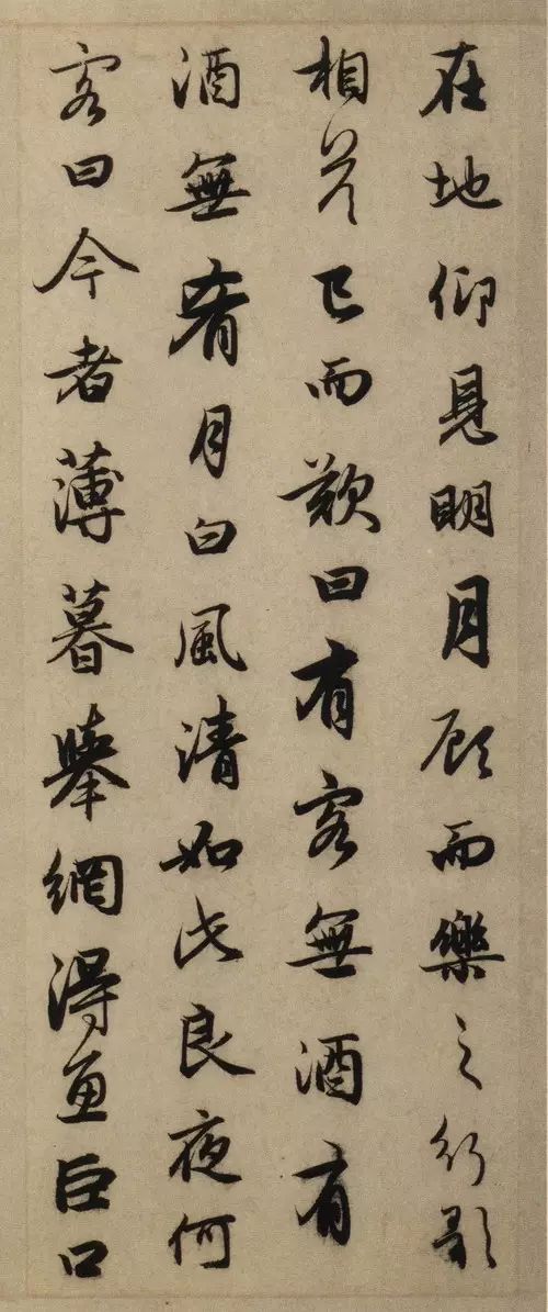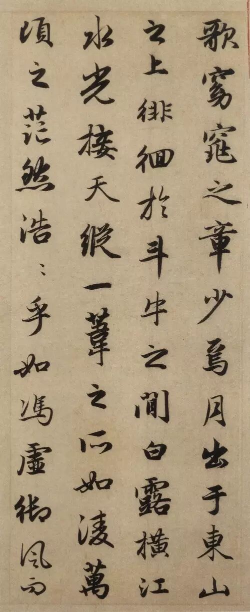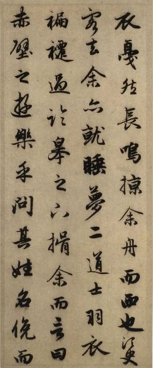 在《前后赤壁赋》中,左右结构的字令其长短相携,高低俯仰,如附图中“旗”、“顾”、“踞”三字;上下结构的字令其宽窄变幻,窈窕多姿,如“惊”、“梦”、“裳”三字。独体字令其点画参差,笔致活脱,如“亦”、“也”、“月”三字。