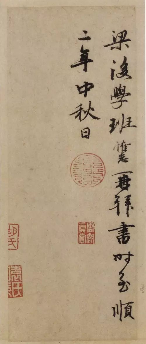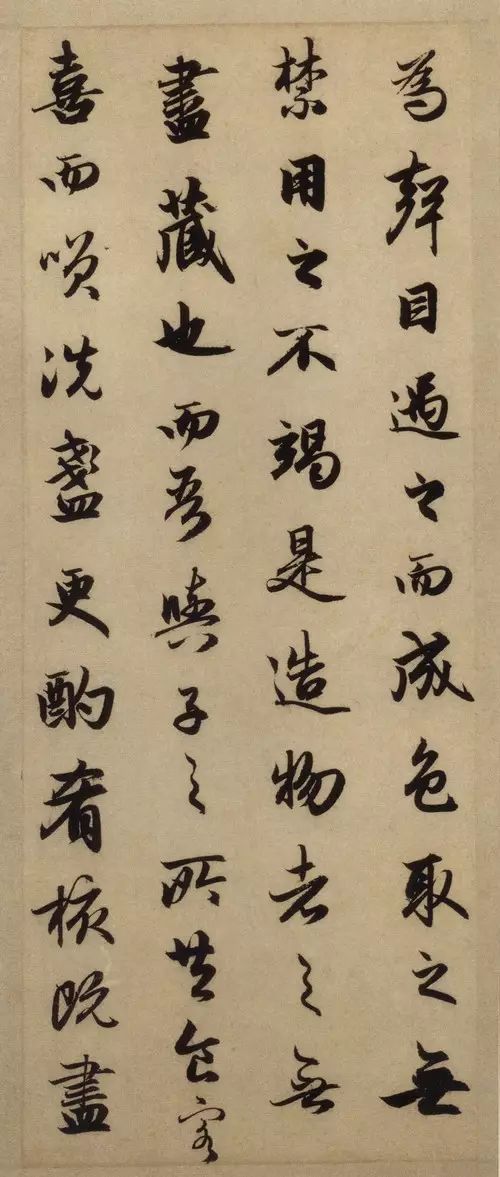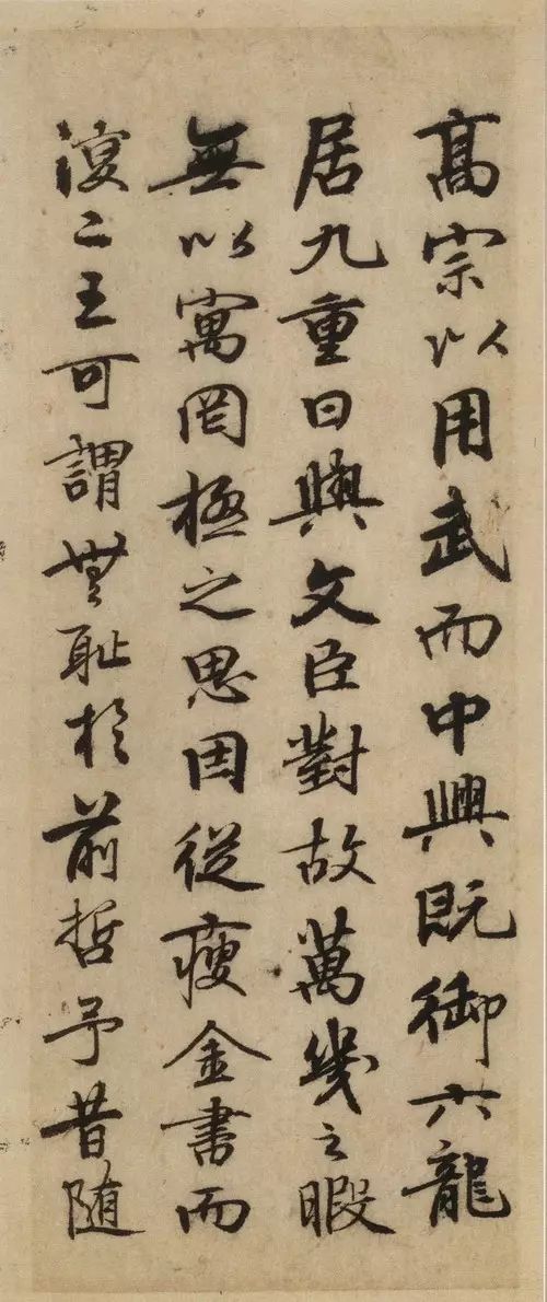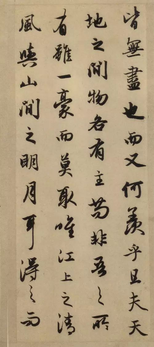 ①起笔上的不同。如附图中“天”、“哉”二字,上横系尖锋入纸、腕内翻而成,呈仰势;“于”、“在”二字的上横,尖锋入纸后笔肚稍顿再上行,呈饱满、 蕴藉之态;“江”、“巨”下横锋入纸后腕迅速内转发力,显得浑穆而郁勃;“清”、“吾”二字的下横与上一笔连贯而出,可视为藏锋逆入,显得圆劲婉转。