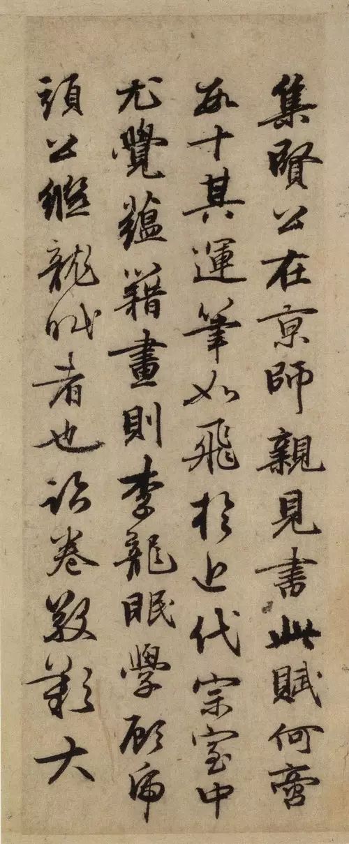 当然这种横向取势只是其字法的主旋律,其间亦不乏方形或长形结构的穿插。“谨于结构”(清人梁▲语)的赵孟頫不会忽视这一点。他采用较大的字距留白、活泼多变的字形、适时的纵向取势,偶尔的草书参差等方式,使这种横向取势成为美妙的音符。