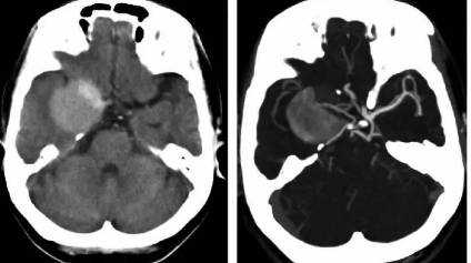 ①无血栓动脉瘤:平扫为圆形等或略高密度影,边缘清楚,病灶周围无或轻度水肿。增强有均匀强化。