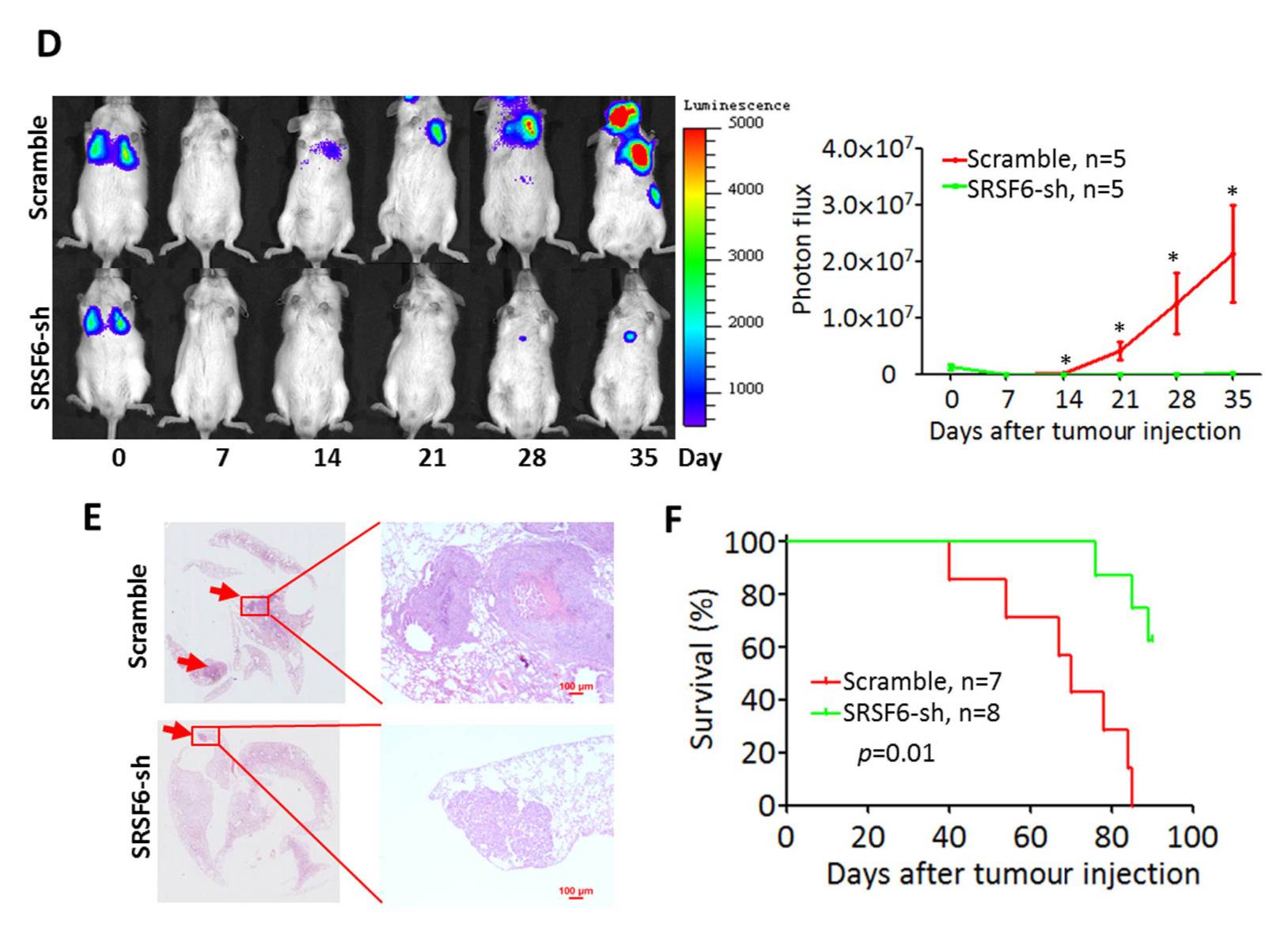 3、SRSF6体内作用:异种移植模型、SRSF6 shRNA、免疫反应性测定、H&E染色分析、荧光成像实验等