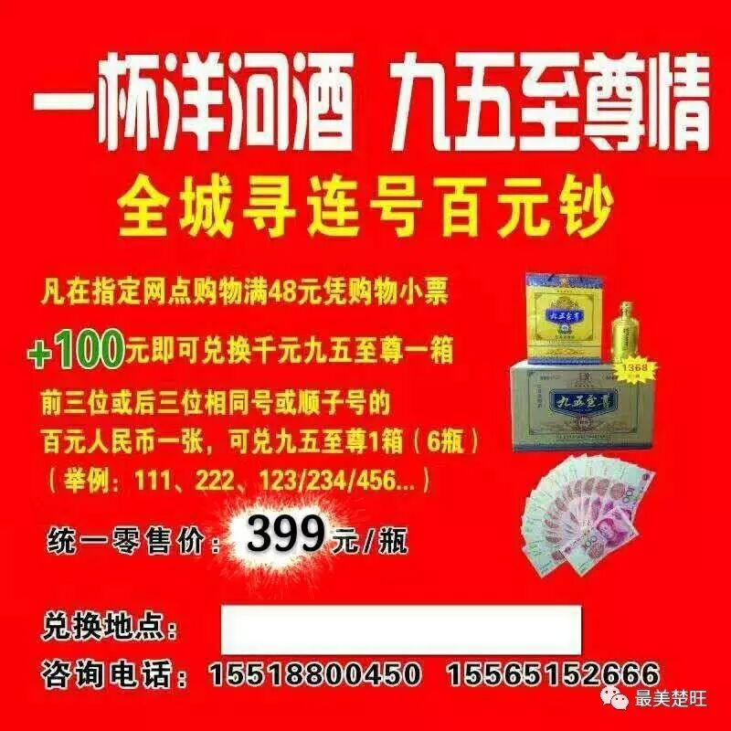 此信息连续转发朋友圈(10天)免费领取价值399元九五至尊(御尊)一瓶。兑换地址:海元物流园。