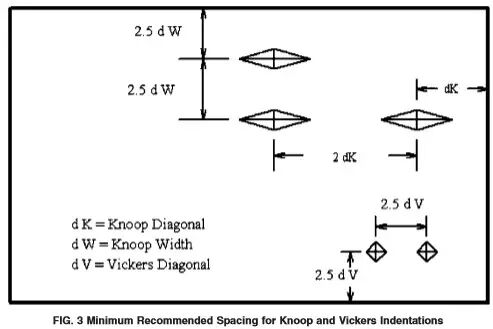 各种硬度测试标准都明确规定了压痕间距及压痕到样品边缘最小距离要求(见图17),对于硬脆的表面薄层,适合用努氏硬度技术测试。但是,一些形状复杂的镀层测试操作复杂,耗时耗力。
