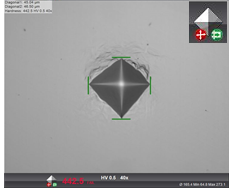 硬度测试过程中,要保证压头加载方向与样品表面呈垂直方向,否则可能导致测试结果不可靠。针对这一要求,一些新型高端硬度计的附加功能可根据样品表面水平平面度实现颜色标识效果,见图7和图8。这类软件同时具有压痕对称性判别功能,见图9和图10。