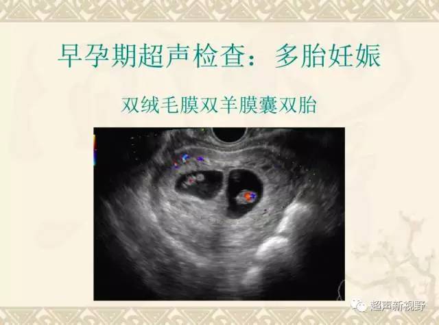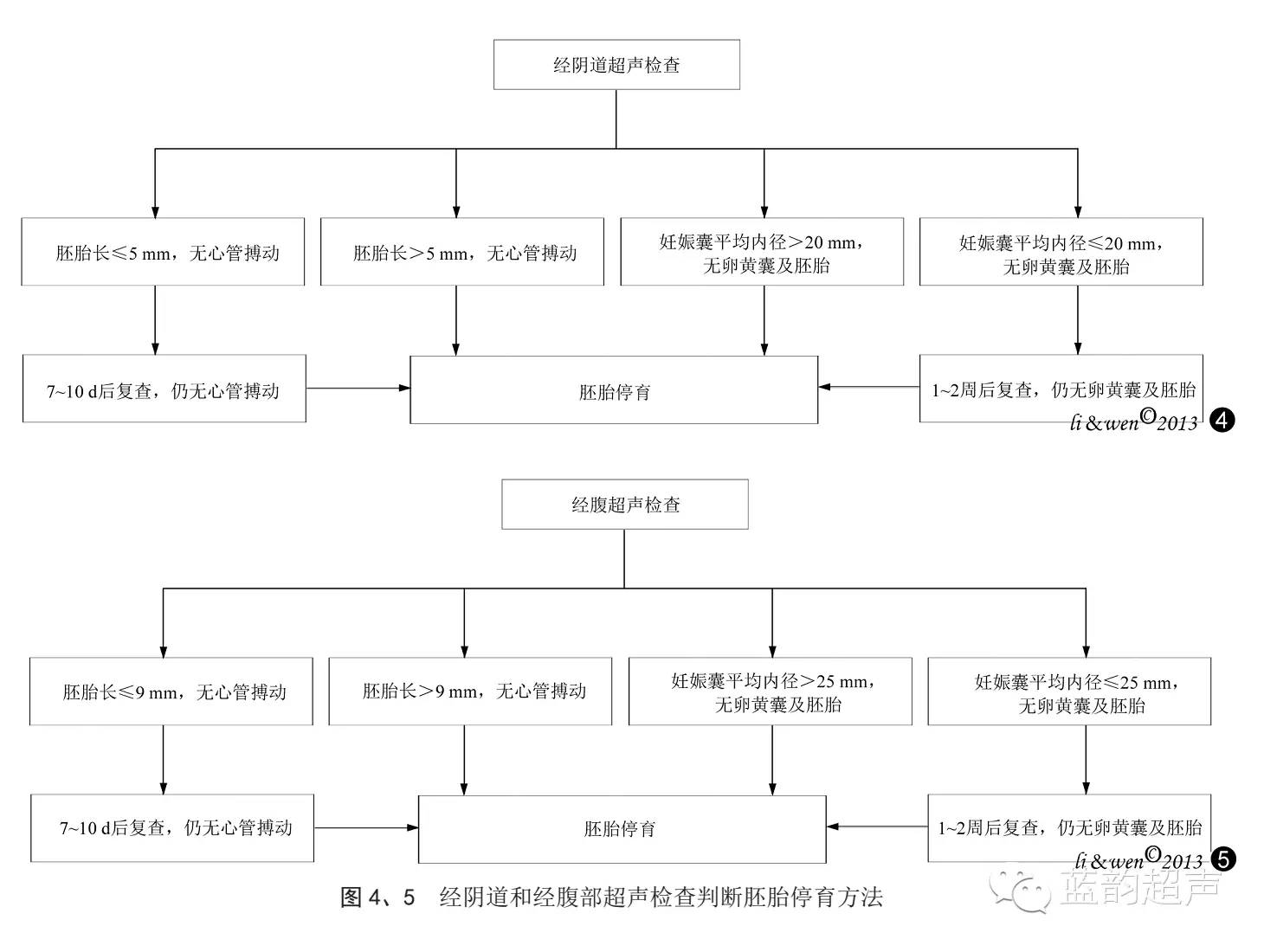 胚芽:经阴道超声最早 6 周,经腹超声最早 7 周可以见到胚芽及胎心搏动。