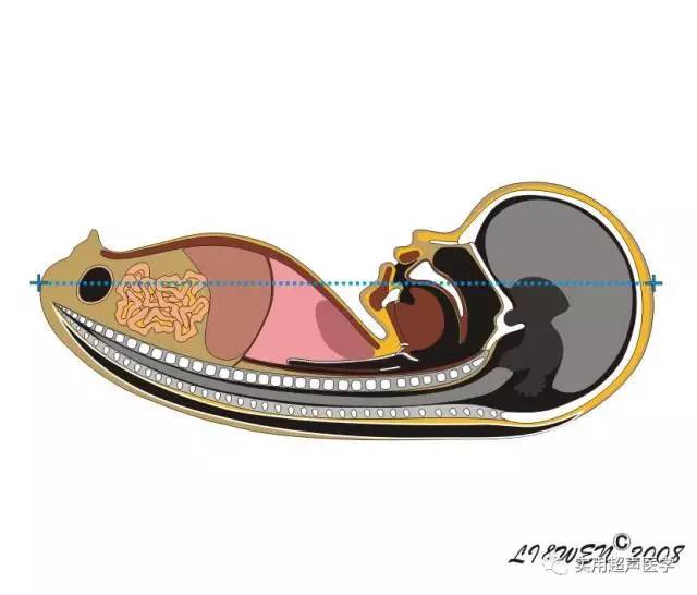 11~12周:此时胎头的颅骨环回声仍不强,脊柱可辨认,为平行的两条串珠状高回声,颅内可见居中的大脑镰,对称的大脑半球,可见比例较大的双侧侧腑室、侧脑室内脉络膜丛、丘脑、后颅窝;头面耳廓开始显现;约25%能辨认出四腔心结构,也能判断心脏的位置;胎儿腹部生理性中肠疝缩小,此期开始逐渐消失;四肢的骨骼也可显示、测量;此期肾脏发育完善,高分辨力的阴道探头扫查可以显示双侧肾脏和膀胱;外生殖器已由生殖结节发育成初阴,形成一小突起,但尚不能判断性别。