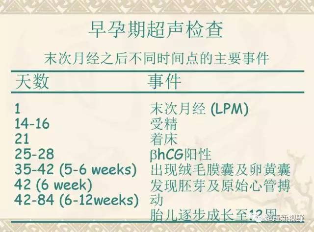 6周:出现胎心搏动,有胎芽和胎心搏动声像可确诊为正常妊娠。三维超声显示胚胎外形轮廓,呈豆点状。