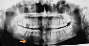 体格检查发现:右侧下颌骨可扪及一 2*4cm 大小肿块,质硬,不可活动,与周围组织分界欠清。表面皮肤无红肿溃烂。左侧腮腺区可见腮腺手术术后瘢痕。未扪及肿大淋巴结。全景片示:右侧下颌第一前磨牙至下颌右侧第一磨牙骨质边界不清的边界,累及牙齿呈浮动的牙齿外观,有牙根吸收。