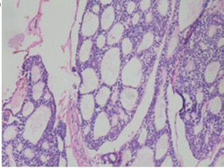 活检结果显示,肿瘤细胞呈筛状生长模式,由基底样细胞深染棱角核包围假性囊肿,使整个结构呈现出典型的“瑞士奶酪”样