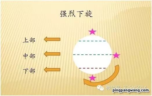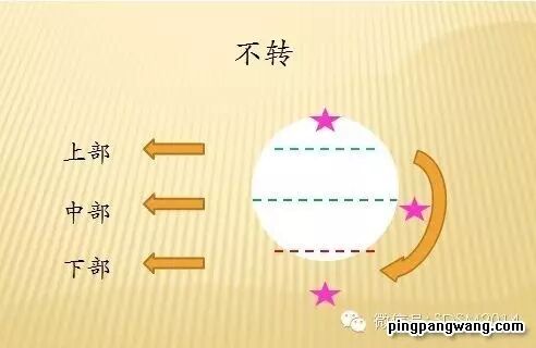 当来球旋转不同时,首先,触球的部位和板型不同,不转的从中上部往中下部摩擦,一般的由中部往下部摩擦,强下旋由中下部往底部摩擦。其次,引板的高度不同,不转的引板略高,一般的高度适中,强下旋引板略低。第三,发力方向不同,不转的向下发力多;一般的向前向下;转的向前多。这三张图也解释了为什么触球瞬间,有的手腕往下点一下,有需要往前制动。