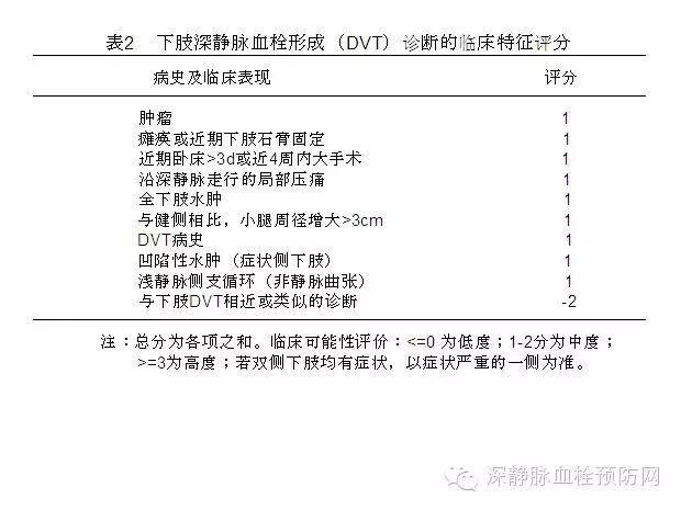 DVT的临床可能性评估参考Wells临床评分(表2),DVT诊断流程见图1。