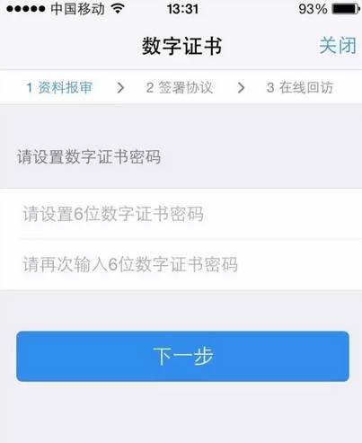 在安装数字证书之前,我们需要设置6位数字证书的密码,密码是您自定义设定。两次输入相同的数字证书密码后,点击”下一步“按钮,安装数字证书。