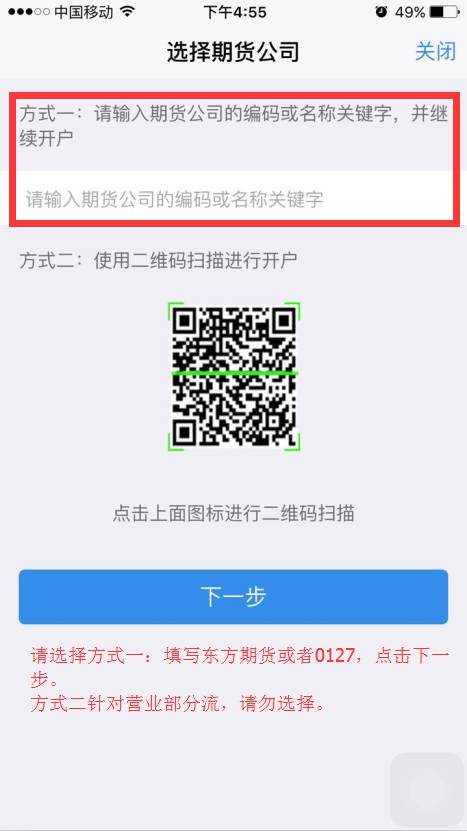 选择期货公司,在方式一空格内输入“东方期货”或者东方期货代码 “0127”