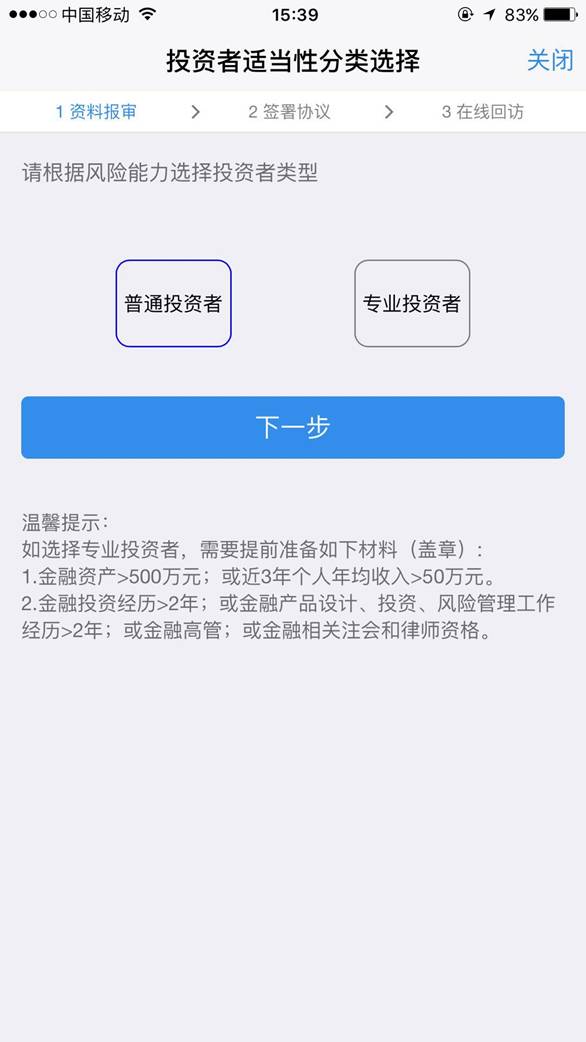根据实际情况选择适当性分类(专业投资者需提供详细资产和投资经验证明,详见页面下方)
