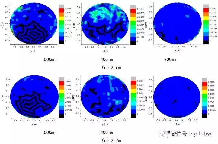 分别取x=3、4、5、6、7五个截面为研究对象,径进一步后处理,显示各截面颗粒相质量浓度云图如图6所示,各截面颗粒浓度分布极不均匀,大部分处于低浓度区,高浓度区域小于1/3,且最高浓度值仅集中在极小的区域,沿x轴方向均匀性有所提高,浓度最高值减小,分布区域增大,且由于重力原因,高浓度区位置逐渐下降。管径减小,颗粒分布的均匀性有所提高,400mm管径均匀性明显好于500mm工况。