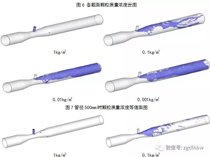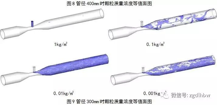 3、经过比较发现各工况的颗粒均匀分布能力为:400mm>300mm>500mm,并不是管径越小颗粒分布均匀性就越好,这是因为管径越小,文丘里管所产生的湍流强度和速度扰流程度越大,湍流既起到了物料掺混作用,使颗粒均匀性提高,又会产生强烈的浓淡分离现象,引起颗粒局部富集;