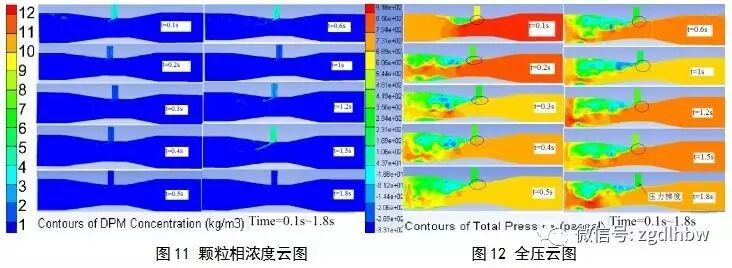 图11、图12分别为y=0时截面的颗粒浓度和全压云图,我们分别取t=0.1、0.2、0.3、0.4、0.5、0.6、1、1.2、1.5、1.8s时刻数据结果。物料在下料管内浓度随着时间变化明显,浓淡交替,这是由于文丘里管窄管处流速较快,同下料管之间存在明显的总压压差,此时,物料想顺利进入文丘里管,必须克服压力梯度力做功,因此,物料首先在下料管内聚集,等物料团总体重力大于压力剃度力时,物料团才进入文丘里管,因此导致此处物料不连续,浓淡不均。