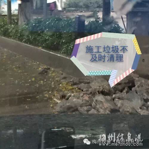 今早路过梅州嘉应大学西校门红绿灯时、哇噻、塞车、心想:也许是车多红绿灯等侯时间长吧、耐心等候16分钟左右!奶奶的、如此施工的。马路南北方向都挖了30CM宽的沟沟呀!施工标志没有、限速、慢行标志没有!施工现场乱七八糟。施工垃圾没有清理!无人管理现场!乱、差、堵!学校附近学生出入又多!听说挖了差不多一星期了!也能理解、冷天、干活的都是临时工哩。不用路过此地、堵堵你小市民又如何!大家如何看?