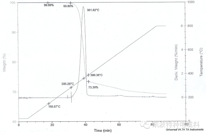 目前电缆料使用的阻燃剂一般分为有机阻燃剂和无机阻燃剂两大类,其中无机阻燃剂一般包括氢氧化铝、氢氧化镁、三氧化二锑(一般和溴类阻燃剂协效使用)等等,另外还有一些无机阻燃协效剂如碳酸钙和硅酸盐类等等。其中无机阻燃剂中以氢氧化铝、氢氧化镁使用比较普遍,用量也比较多,现以氢氧化镁为例来说明电缆料中的有些无机阻燃剂如何影响碳黑含量的测试。将氢氧化镁作TGA测试,结果如图所示,从图中可以看出,氢氧化镁大概在285℃左右开始分解,大概经过60min左右,氢氧化镁才分解完毕至恒重。