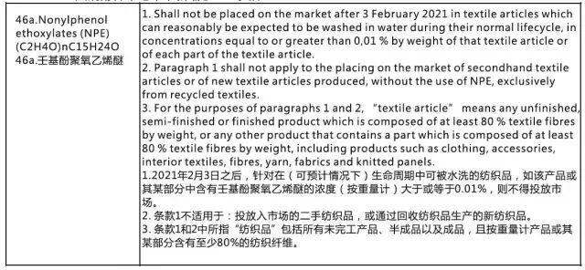 从2021年2月3日起,在合理可预计的情况下,其正常使用周期中能被水洗的纺织品,若含壬基酚聚氧乙烯醚(NPE)含量超过0.01%,则被禁止投放市场。