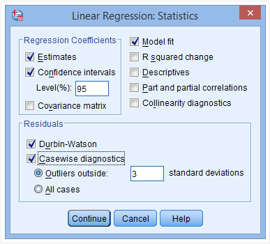 (4) 在Regression Coefficient框内点选Confidence intervals,并在Residuals框内点选Durbin-Watson和Casewise diagnosis