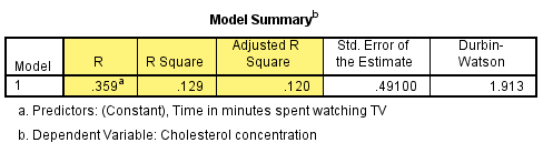 第二个标黄的指标R2(R Square)代表回归模型中自变量对因变量变异的解释程度,是分析回归结果的开始。本研究中,R2=0.129,提示自变量(看电视时间)可以解释12.9%的因变量(胆固醇浓度)变异。但是,R2是基于样本数据计算出来的,会夸大自变量对因变量变异的解释程度。