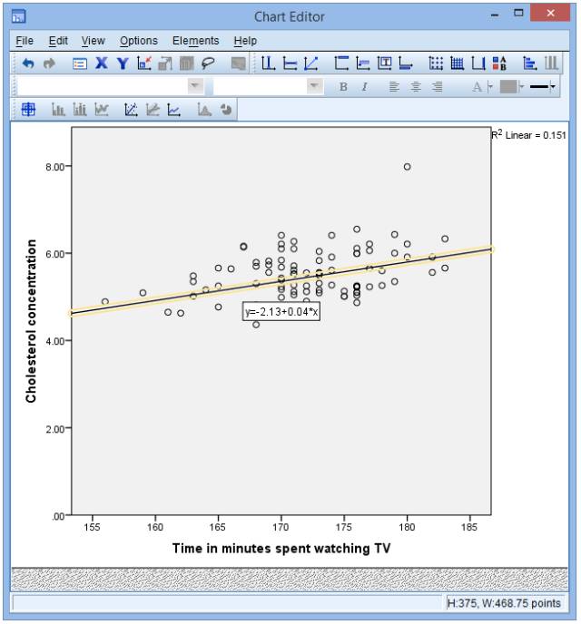 简单线性回归结果提示,看电视时间与胆固醇浓度之间存在线性关系F(1,97) = 14.395(P <0.001);看电视时间可以解释胆固醇浓度变异的12.9%。回归方程如下:
