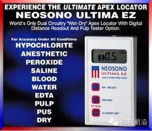 Neosono Ultima Ez根尖定位仪(Satelec Inc;Mount Laurel,N. J.)是第三代定位仪,它是第二代中Sono-Explorer系列的改进型。为绕过日本的双相交流电频率专利,Amadent公司发明了一种可有多种电流频率的仪器,它通过植入一微芯片而从中挑出两种频率,以便在湿润或干燥状态下给出精确读数。在次氯酸钠存在的条件下使用效果最好。Ultima Ez装配有可显示根管锉位置的显示系统以及声音提示器。对于根尖孔未闭合者,通过将读数设定为0.5mm或1.0mm,也可以进行测量。它还附有牙髓测试仪,称为Co-Pilot(Amadent;Cherry Hill,N. J.)。时至今日,Dental Advisor(Ogden,Utah)公司5名使用了该仪器26次的顾问报告称,在湿润的根管内更加可靠。他们还宣称它“快速易用”。