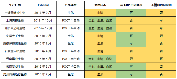 SAA项目的试剂盒最早由西门子在国内注册上市,但推广成效较差,主要原因还是产品不符合该项目的应用需求。国产试剂最早上市的是宁波普瑞柏生物的生化试剂,但最早推出符合市场需求的POCT产品的是上海奥普生物,他们开发的POCT产品得到了用户的广泛认可,至今仍是该项目市场占有量最大的品牌。