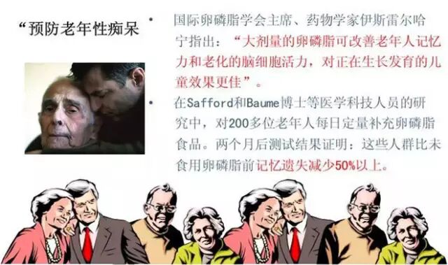 脑部的神经传导物质(乙酰胆碱)减少是引起老年痴呆的主要原因,乙酰胆碱是神经系统信息传递时必需的化合物。而且“胆碱”是卵磷脂的基本成分,卵磷脂的充分供应将保证机体内有足够的胆碱与人体内的乙酰结合为“乙酰胆碱”,从而成为大脑提供充分的信息传导物质,大脑能直接从血液中摄取卵磷脂及胆碱,并很快转化为乙酰胆碱。长期补充卵磷脂可以减缓记忆力衰退的进程,预防或推迟老年痴呆的发生。