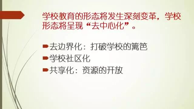 - 第一,从功能上讲,未来学校将呈现出教育的“去中心化”趋势,也就是学校作为传授知识的中心这个概念将会被颠覆;