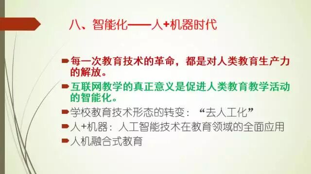 事实上,人类社会的每一次教育技术的革命,都是对人类教育生产力的解放。互联网教学的真正意义是促进人类教育教学活动的智能化。未来学校教育进入“人+机器”时代,意味着互联网、物联网和人工智能技术在教育领域的全面应用,我们深切地呼唤着这种人机融合的新教育时代的到来!未来学校要大力推进“去人工化”,一切教育教学活动凡是机器能干的,都要交给机器去做,这是未来学校智能化的必然要求。