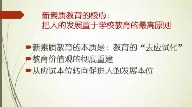 新时代教育发展主要矛盾的转变,意味着我国教育的功能定位将从工具本位转向以人为本。。新素质教育的核心是把人的发展真正置于学校教育的最高原则。从本质上说,就是要真正实现教育的“去应试化”,完成教育价值观的重建,推动整个教育从“应试本位”走向“人的发展本位”。